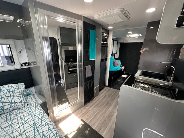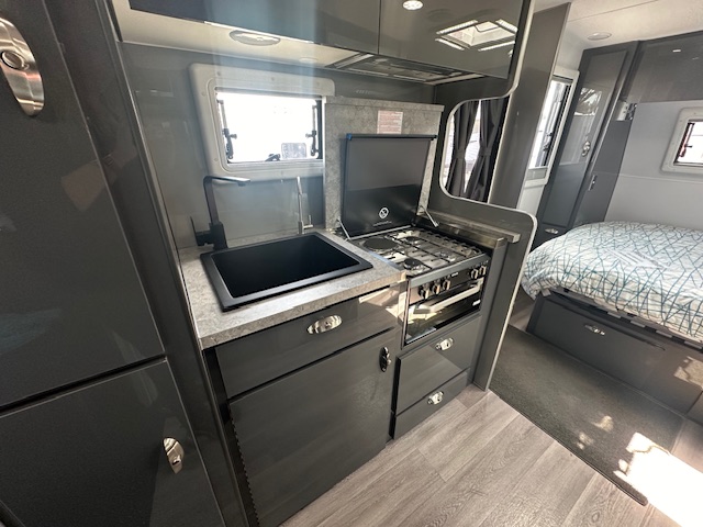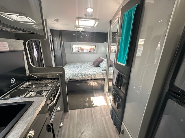 Next to the shower you have the 184 litre 3-way fridge & directly opposite the kitchen with recessed 4 burner grill, stainless sink, microwave & 12v rangehood.