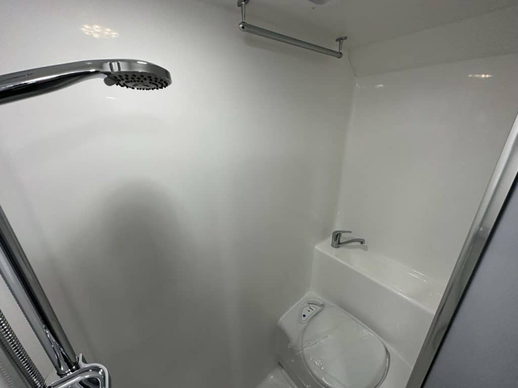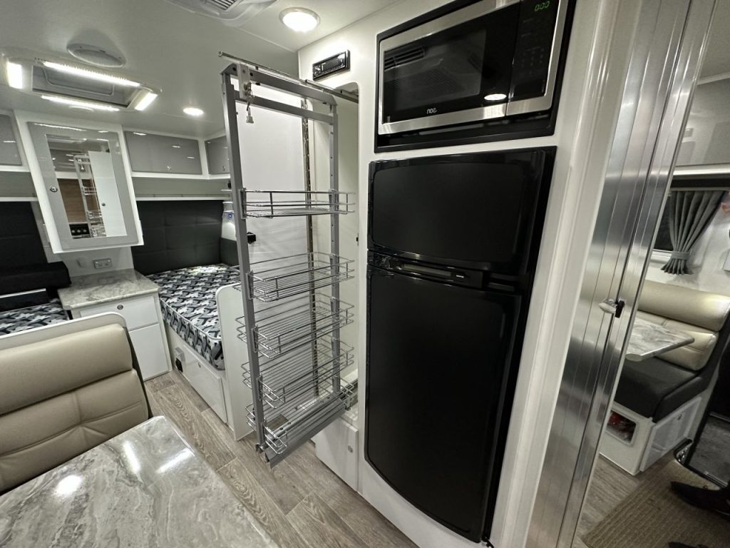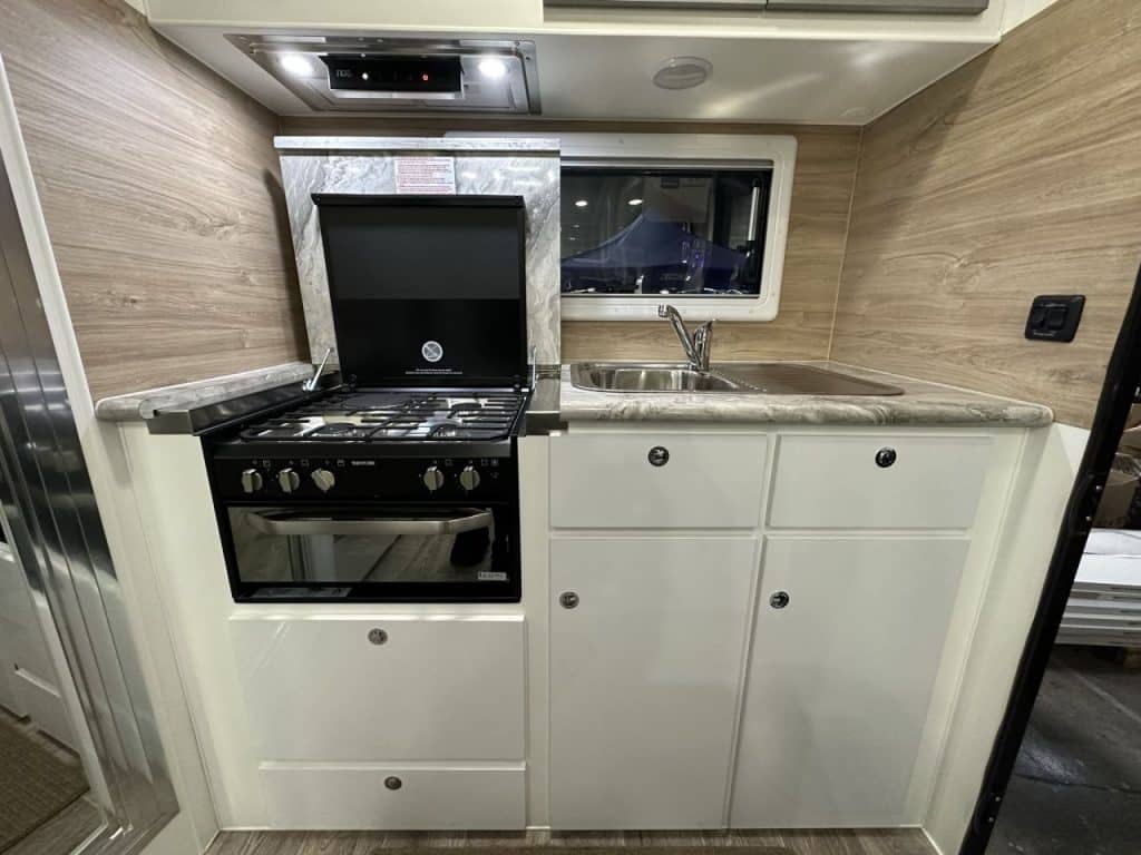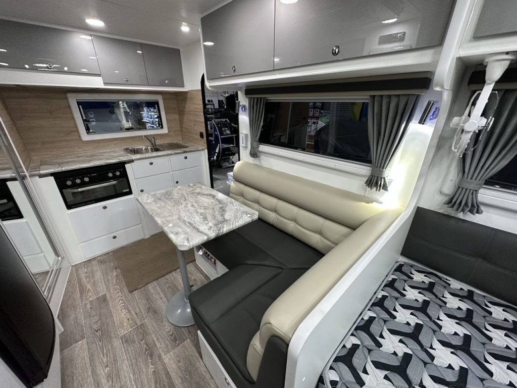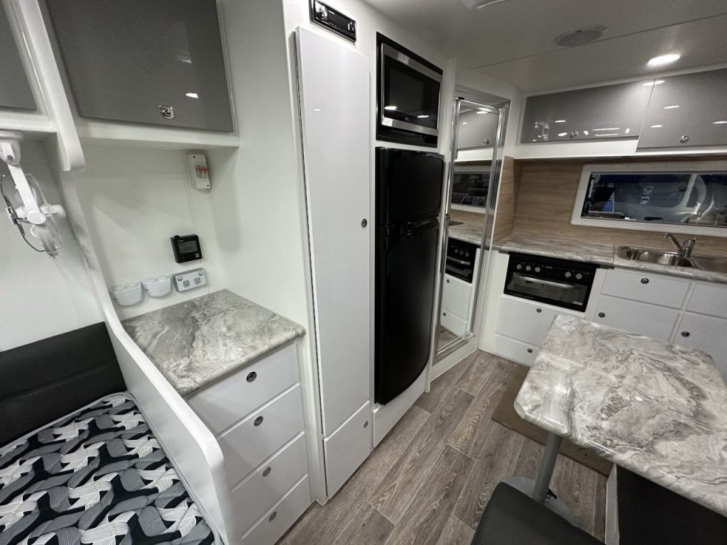Stepping into this rear door layout you are greeted with a rear kitchen and combination shower and toilet. Walking through to the centre of the caravan you have an L-shape lounge with an adjustable table leg to convert to additional sleeping space. Opposite the lounge you have a 2-door 175L 3-way fridge, full-height pull-out pantry, and additional bench space with a bank of drawers located below. To the front of the caravan, you have two custom size single beds that are 6’5 long and 2’9 wide with a floating robe between the two beds and a bedside table for additional convenience.