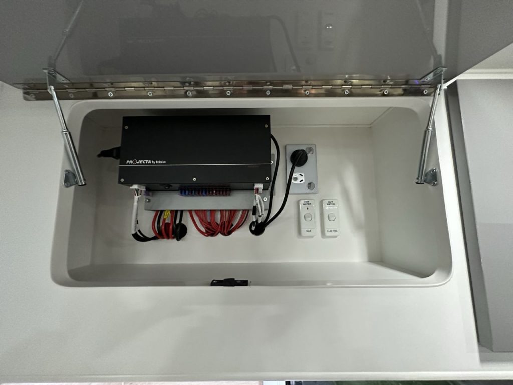 Externally this caravan sits on a rubber torsion 2700kg suspension with 16” rims. An appealing feature of this caravan is the added luxury of an electric awning making it simple and quick to set up with just a touch of a button. This caravan has the ability to take you off the beaten track. With two 200 watt solar panels, 100amp battery, DC/DC charger all being ran off a PM300 charger.