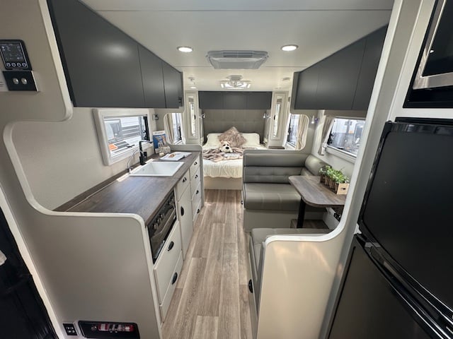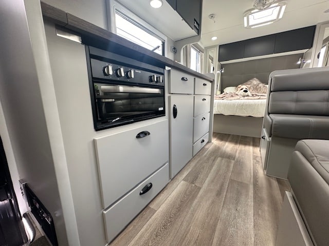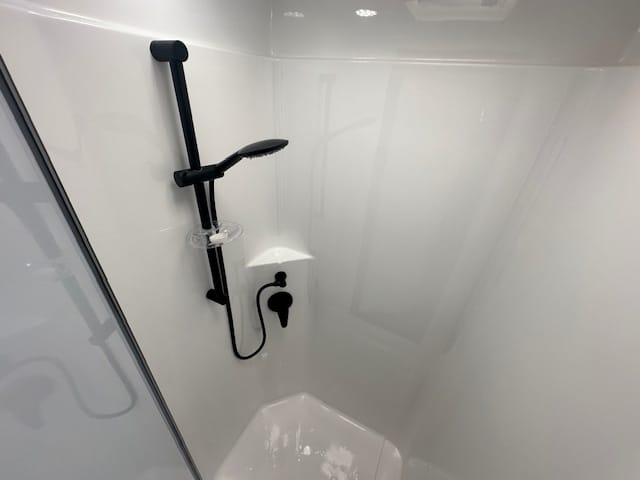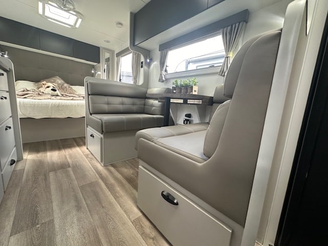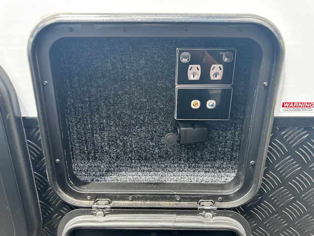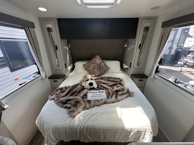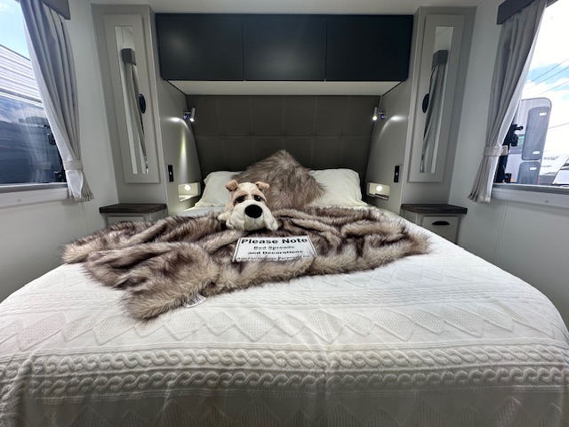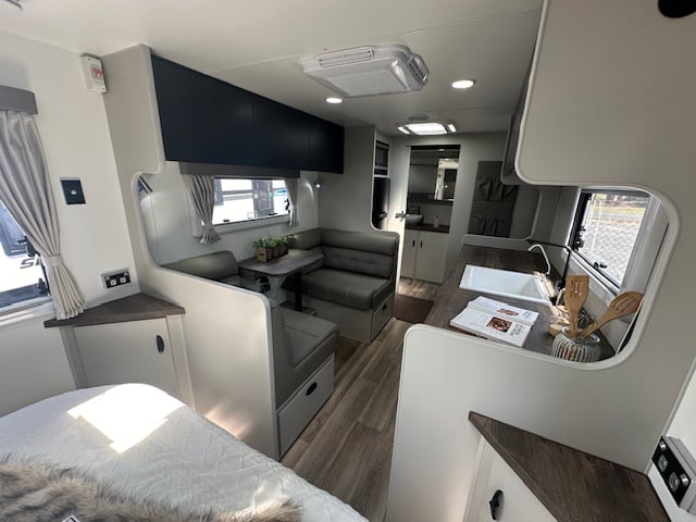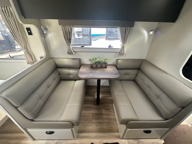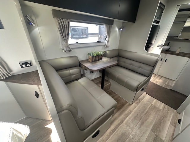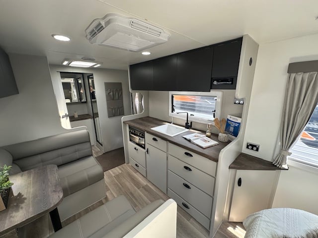 This caravan is displayed with CNC look furniture completing the modern look. This hosts hidden latches on your overhead cupboards for a sleek simplistic feel.