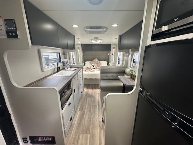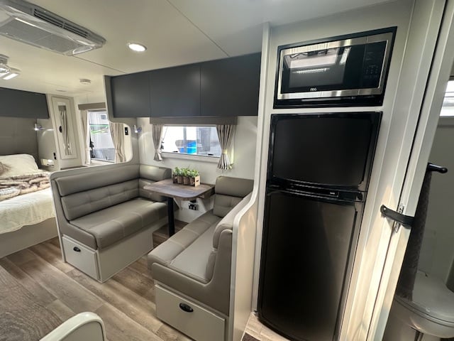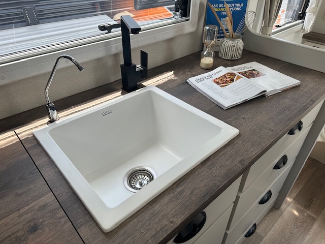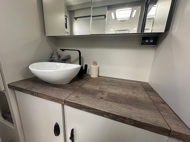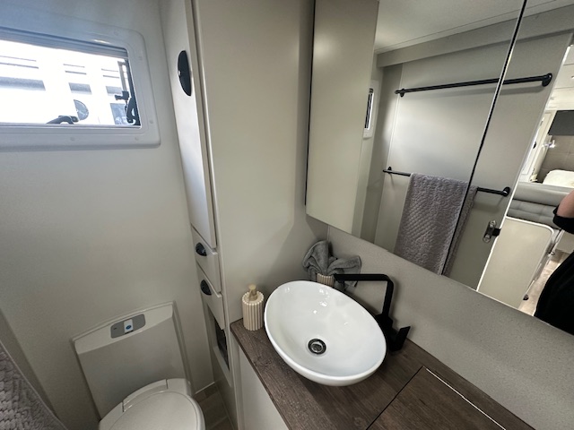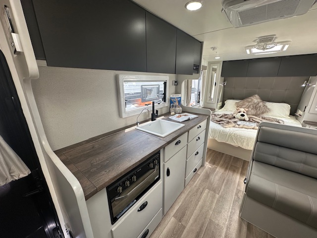 Stepping into the rear of this caravan you have a full sized ensuite to the right. This features a top load washing machine hidden conveniently under a hinged benchtop. This provides additional bench space in the ensuite area. As you walk down the van to the right you have a café seating with a tri-fold table & 2 door 3 way fridge. Opposite the seating you have a well-equipped kitchen with 4 burner stove top and griller. The feature of the kitchen is the eye-catching granite black sink with large dish drainer & timber laminate rolled benchtops.