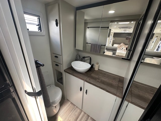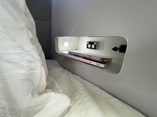 The bedroom is fitted with a Queen size lift up bed with all the storage you need and comfortable innerspring mattress.