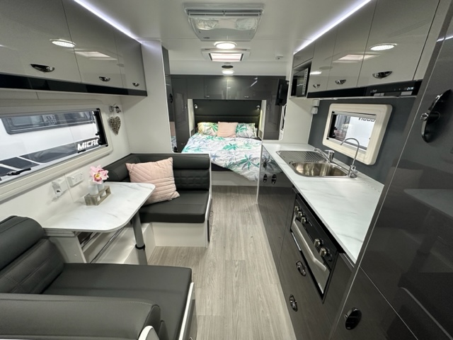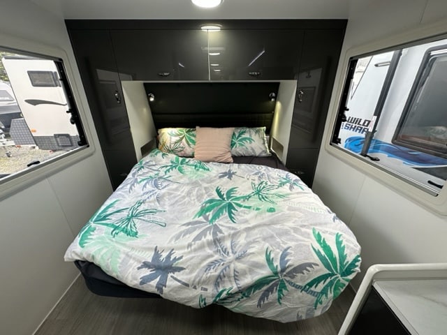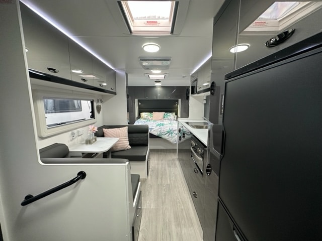 Taking a look at the external of this plentiful 20’6 this caravan sits on a 6″ chassis available in leaf spring or enduro cross country suspension, with 15″ rims and 235 all terrain tyres. Full galvanised Tunnel boot, 1 x 95ltr and 1 x 62ltr water tank that can be optioned with a grey water tank. Has rooftop reverse cycle air conditioning, 28L gas/elec hot water service, and 170watt solar and 110amp battery pack. The side of the caravan has a 17′ awning with picnic table gas bayonet fitting to suit our door living. The caravan has a high profile exterior cladding with reverse camera and trip lock main entry door with security flyscreen door.