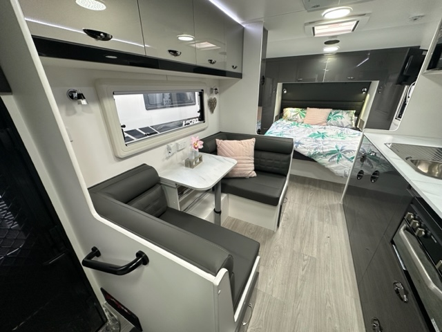 Sitting on a six-inch chassis, coupled with all terrain wheels and tyres, this van can handle national parks and dirt roads with ease. With the option of a café dinette or club lounge, the toilet or shower on either side of the van, or the addition of a full-height linen cupboard on the cafe layout, and a full height pantry added this van is sure to please those who value their storage.