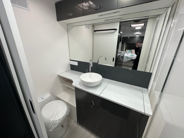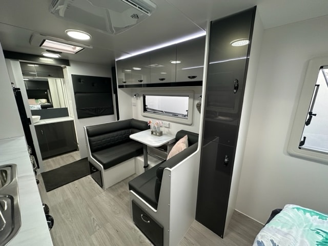 This V3.1 is perfect for couples set to make memories around Australia. As you step into this rear door tandem axle layout you have a full-size ensuite to the right, featuring a stylish vanity, full-size shower, toilet, and top load 2.5kg washing machine under a hinged benchtop. Going through to the kitchen this caravan is displayed with a café dinette with Tri fold table. The kitchen has a 175L 3-way fridge, full-height pantry, recessed oven, and a water filter and tap. The bedroom features a lift-up Queen island bed with robes, port holes with power points and an overhead cupboard with an additional linen cupboard in the bedroom to give additional storage needs.