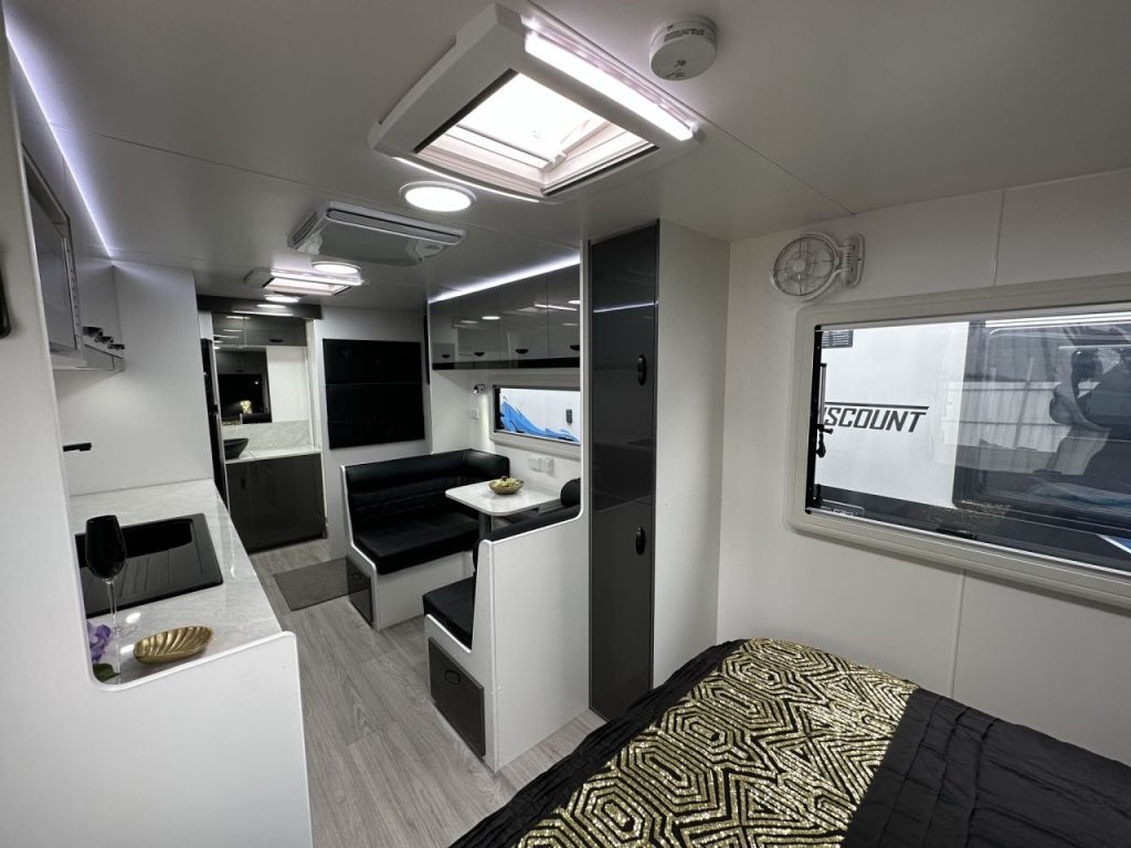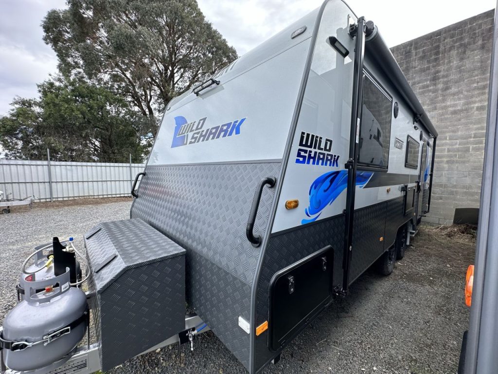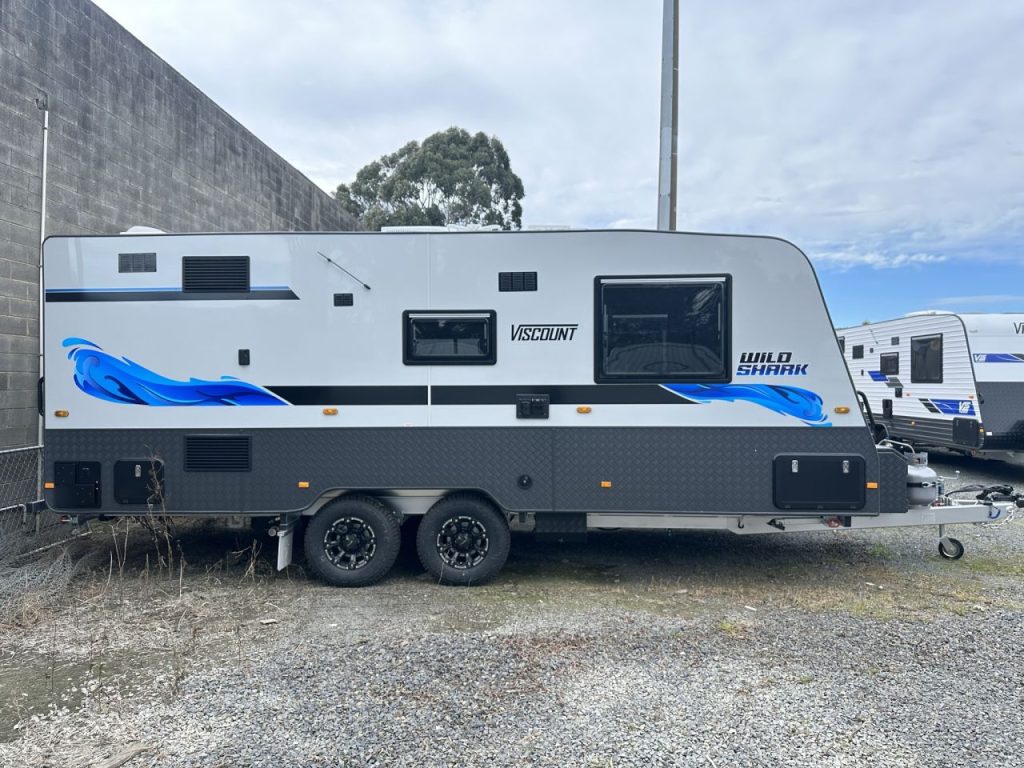 Handcrafted to stand out above the rest, the “WILD SHARK” range includes all the standard features of the Viscount V-Series, plus some stand-out features with the Grey composite cladding, ALKO twin shock coil suspension, BMPRO HA lithium charger, Grey water tank, black pack upgrade to sinks and tap ware and a front TBO7 toolbox. Available in seven layouts, the range caters to families, couples, and solo travellers, with bunk beds, Queen island bed, and single bed options. The “WILD SHARK” range offers greater off-grid capabilities, upgraded appliances, a new, modern interior design, and a rugged exterior finish, ensuring the ultimate holiday experience. Sitting on a 6” chassis, coupled with all-terrain wheels and tyres, the “WILD SHARK” range can handle national parks and dirt roads with ease. With the option of a café dinette lounge or club lounge, the toilet or shower on either side of the ensuite.