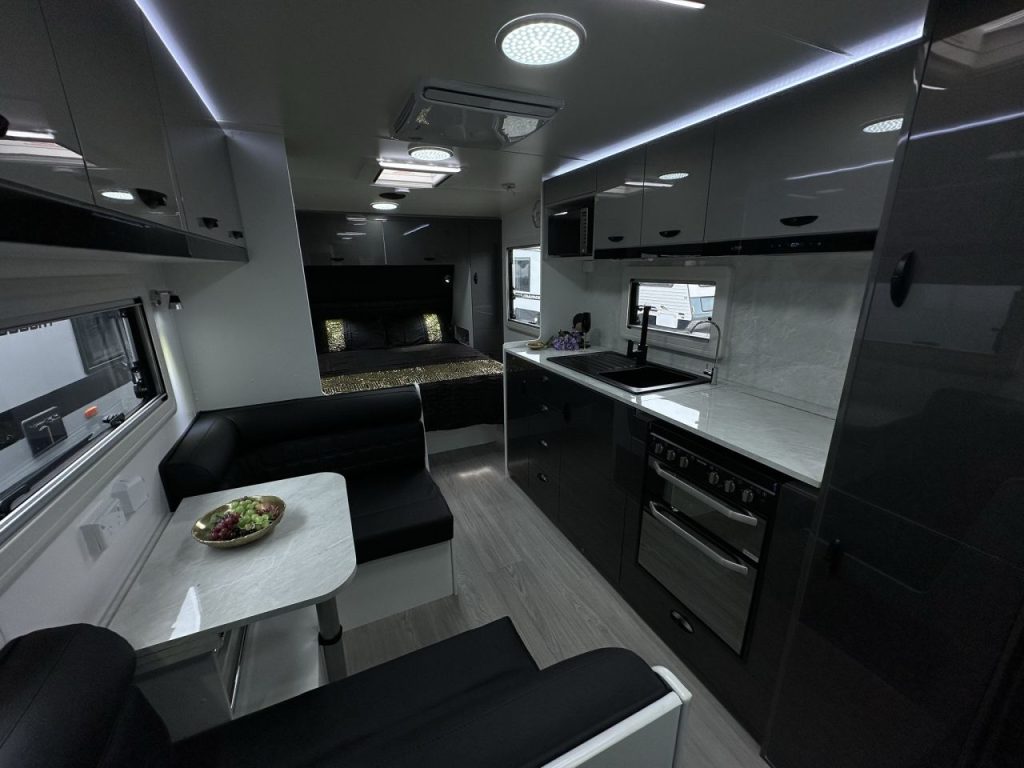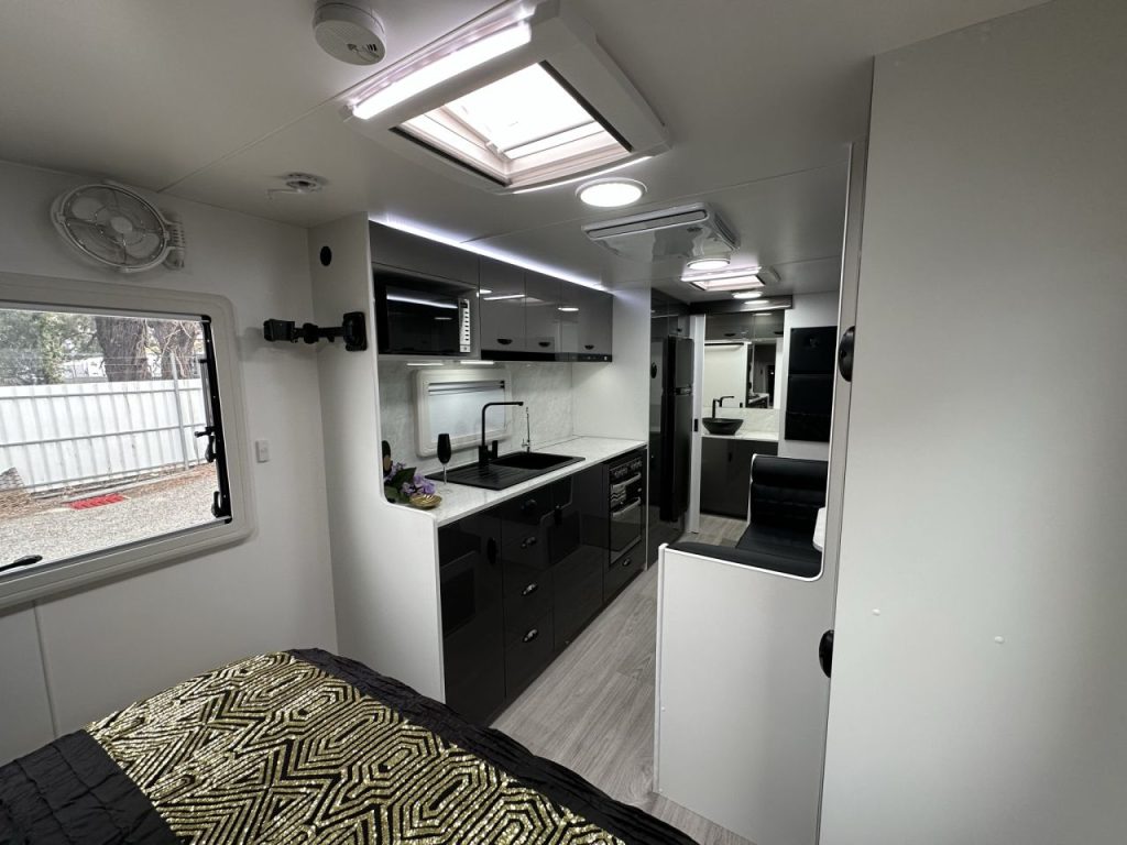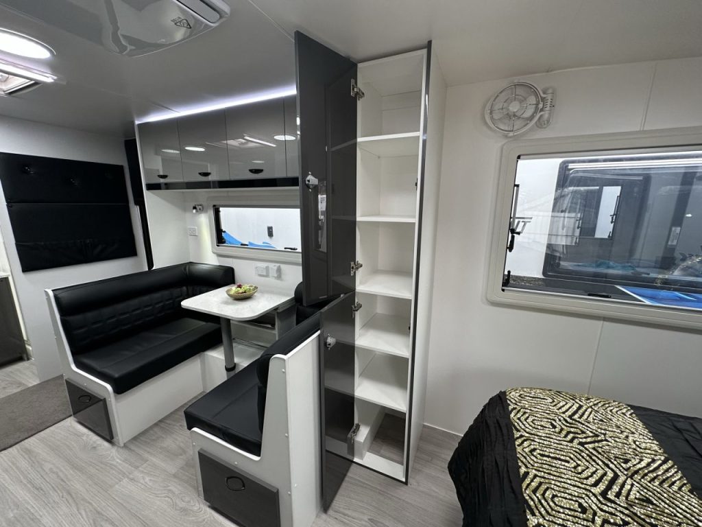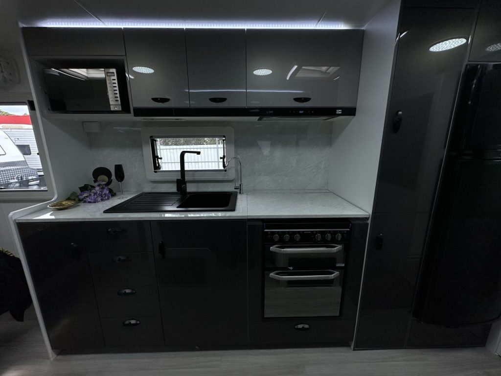 Walking down the caravan you will find a cafe lounge with a tri-fold table to the Left and a spacious kitchen to your right. The kitchen is fitted with a large 175ltr 3-way two-door fridge, microwave, range hood, full oven, grill & 4 burner cooktop. All kitchen & ensuite appointments are trimmed with modern black sinks, taps, and cupboard handles in the “Wildshark” range.