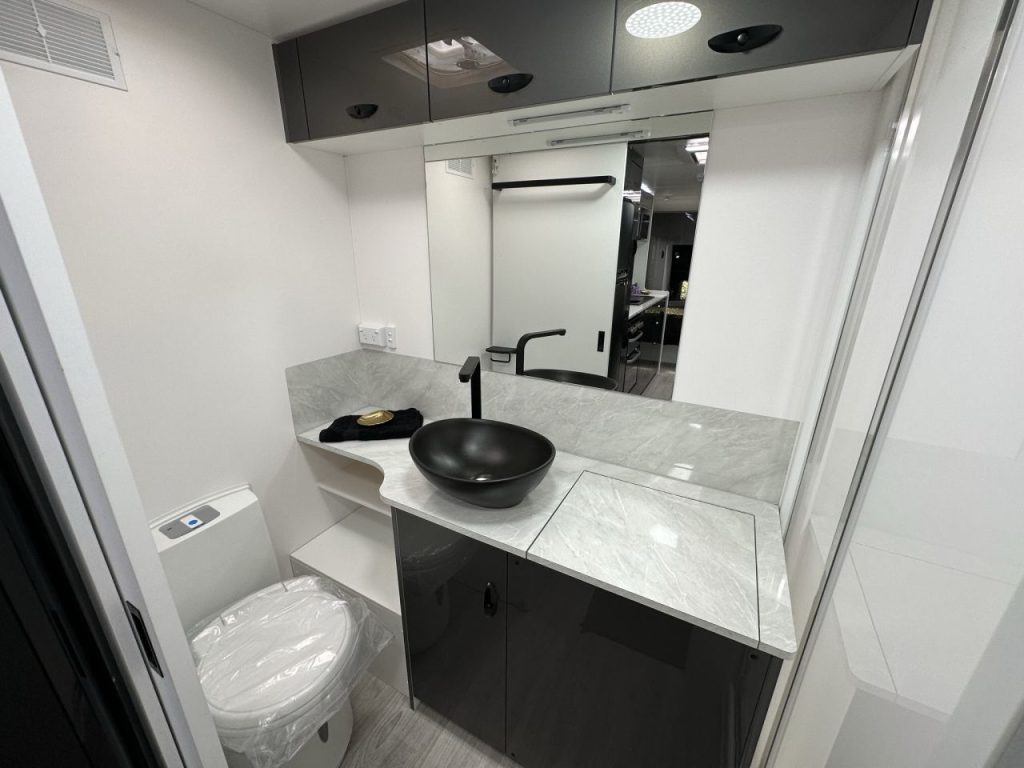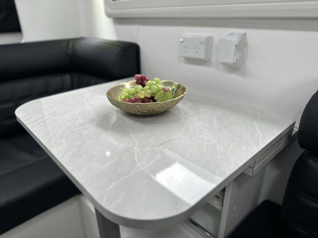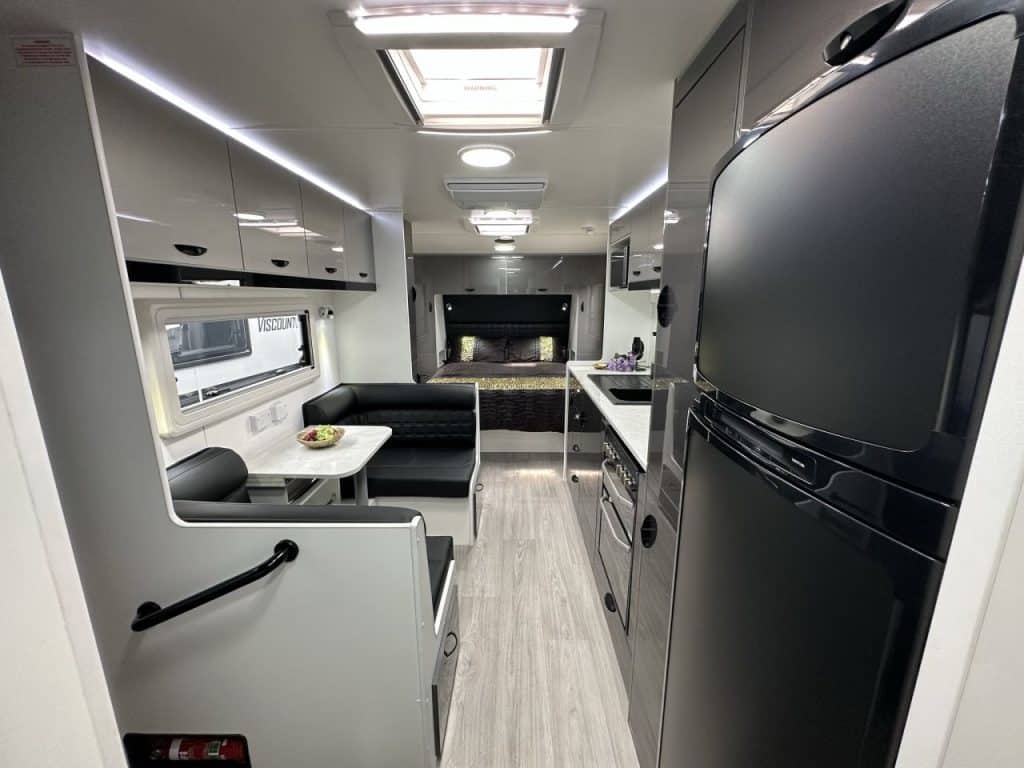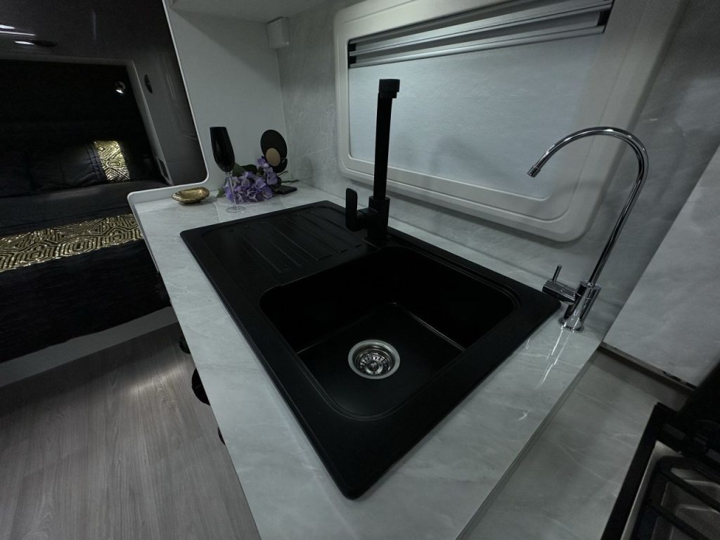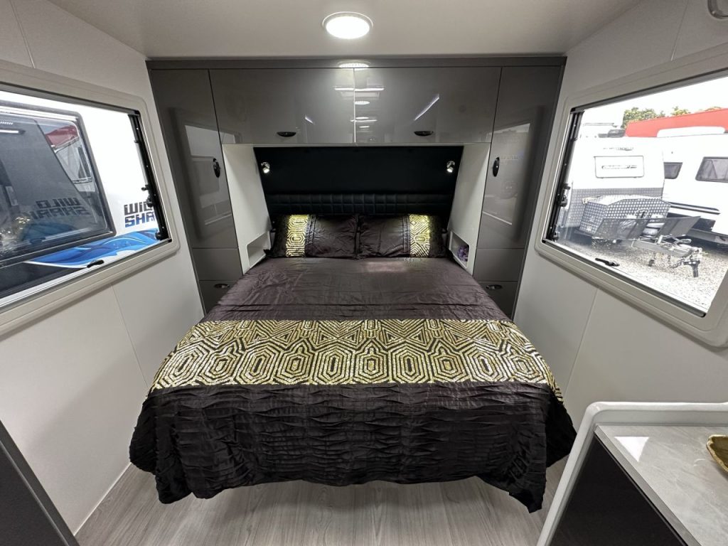 Walking down the caravan you will find a cafe lounge with a tri-fold table to the Left and a spacious kitchen to your right. The kitchen is fitted with a large 175ltr 3-way two-door fridge, microwave, range hood, full oven, grill & 4 burner cooktop. All kitchen & ensuite appointments are trimmed with modern black sinks, taps, and cupboard handles in the “Wildshark” range.
