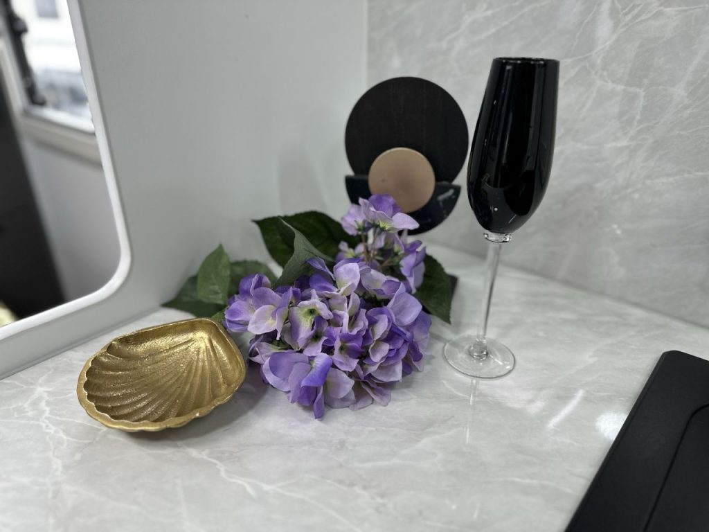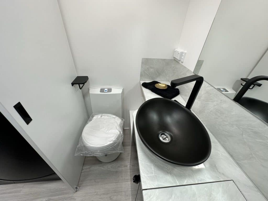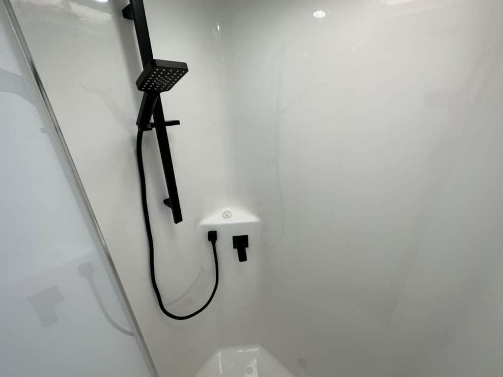 The bedroom has a 6’5 lift Queen bed with a full-height padded bed head. Dual USB/12v/240v outlets can be found in the cubby holes in each robe next to the bed. Providing you with the ability to charge the phones, store your belongings or house the remotes. They are also perfect for those who need to sleep with a CPAP machine.