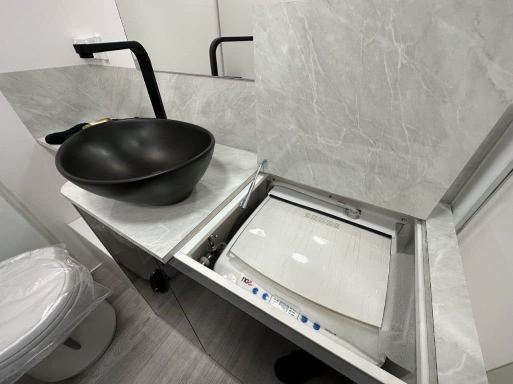 As displayed the Wild Shark 3.1 is a layout with cafe seating & full-height linen cupboard between the seating & bedroom. This layout is perfect for couples that desire some additional cupboard space to cater for linen and of the like. As you step into this caravan you’re greeted with a full-size ensuite to your right. The ensuite is fitted with a generous shower, ceramic swivel toilet, 2.5kg top load washing machine, and a great use of cupboard space.