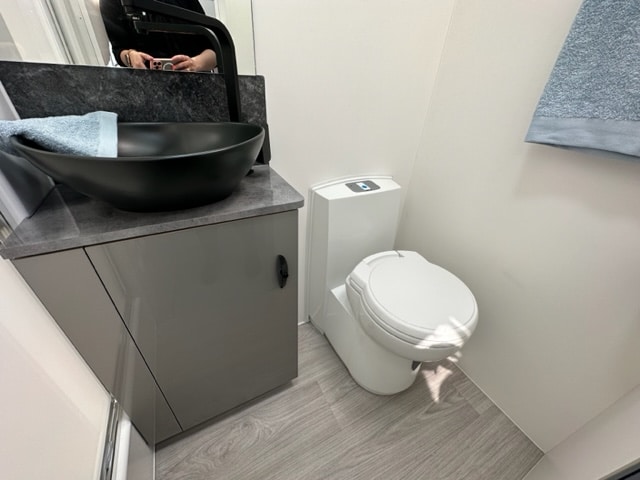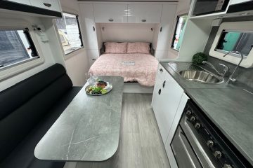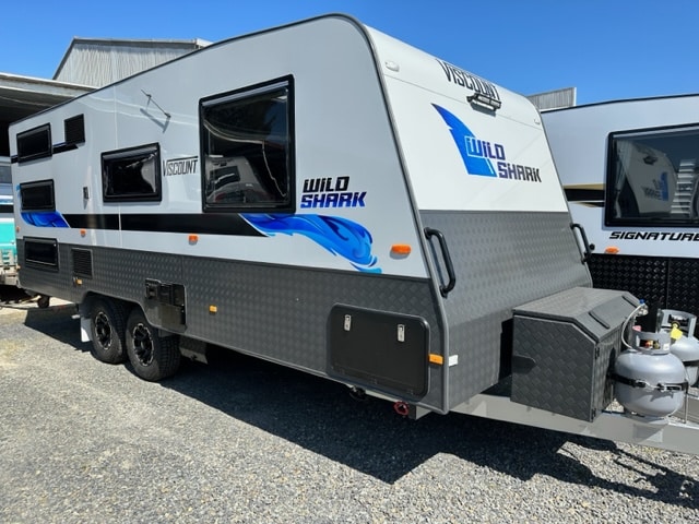 Handcrafted to stand out above the rest, the “WILD SHARK” range includes all the standard features of the Viscount V-Series, plus some stand-out features with the Grey composite cladding, ALKO twin shock coil suspension, BMPRO HA lithium charger, Grey water tank, black pack upgrade to sinks and tap ware and a front TBO7 toolbox. Available in seven layouts, the range caters to families, couples, and solo travelers, with bunk beds, queen island bed, and single bed options. The “WILD SHARK” range offers greater off-grid capabilities, upgraded appliances, a new, modern interior design, and a rugged exterior finish, ensuring the ultimate holiday experience. Sitting on a 6” chassis, coupled with all-terrain wheels and tyres, the “WILD SHARK” range can handle national parks and dirt roads with ease. With the option of a café dinette lounge or club lounge, the toilet or shower on either side of the ensuite.
