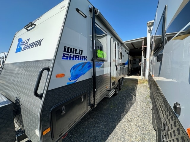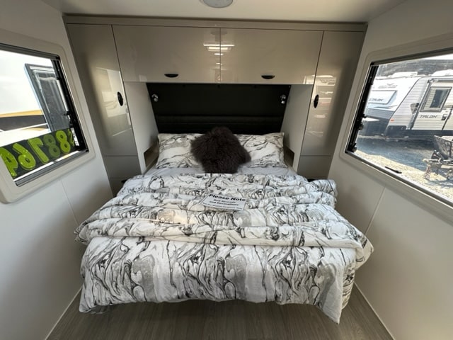 This Wild Shark family can be optioned with 2 or 3 bunks and is perfect for families. As you step into the front of this caravan you’re greeted with the main lift-up queen bed to the left. Full-height padded bed head wrapped with robes and overhead cupboards complete with cubby holes in the robes to give you the ability to store your belongings whilst you’re sleeping.