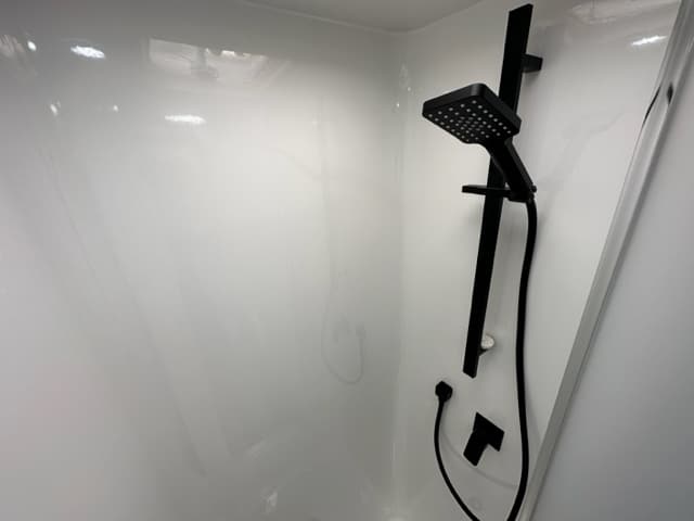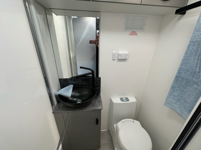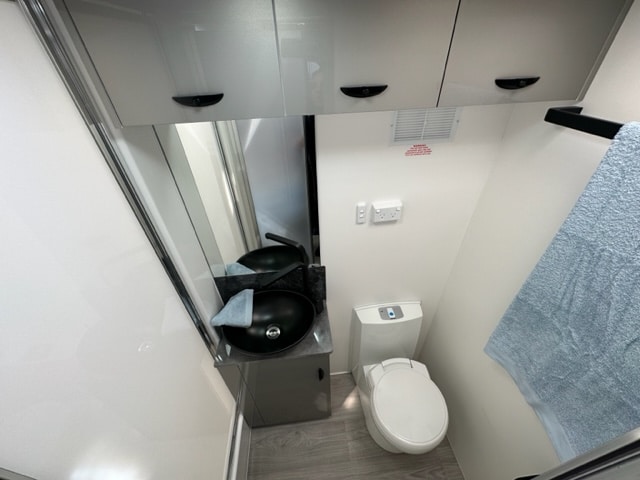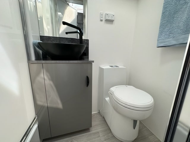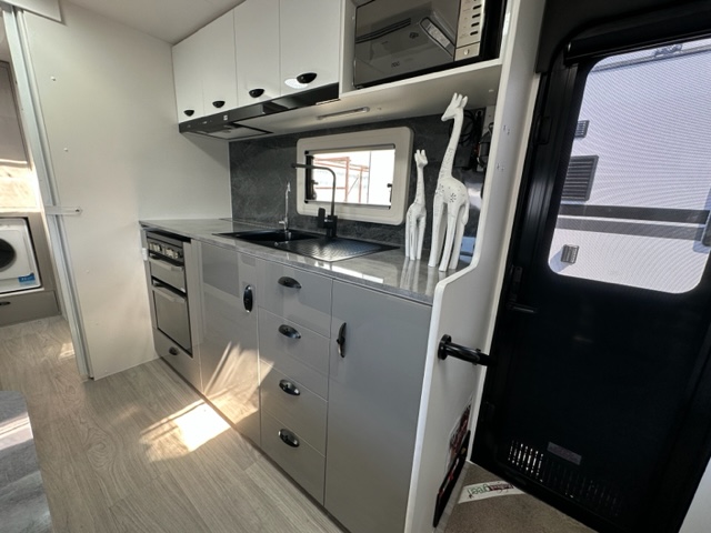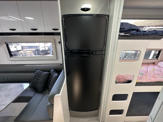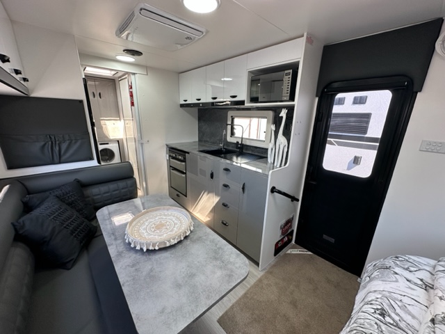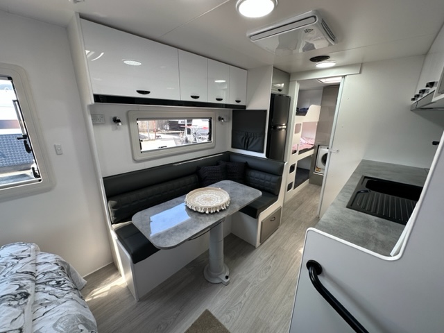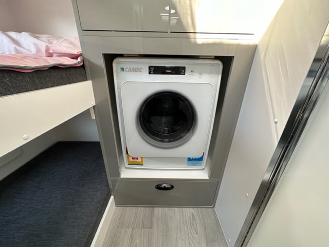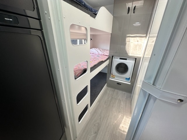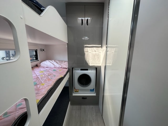 Stepping into the rear of the caravan you will find your bunks located to the left with a robe in the centre of the back wall and a 4kg front load washing machine entering the full-size ensuite to the right you will find your toilet, full-size shower, vanity, and cupboard space to suit the family. This space is divided by a privacy curtain from the main part of the caravan for added privacy.