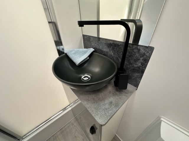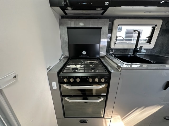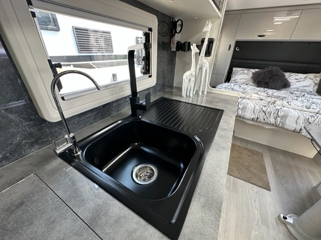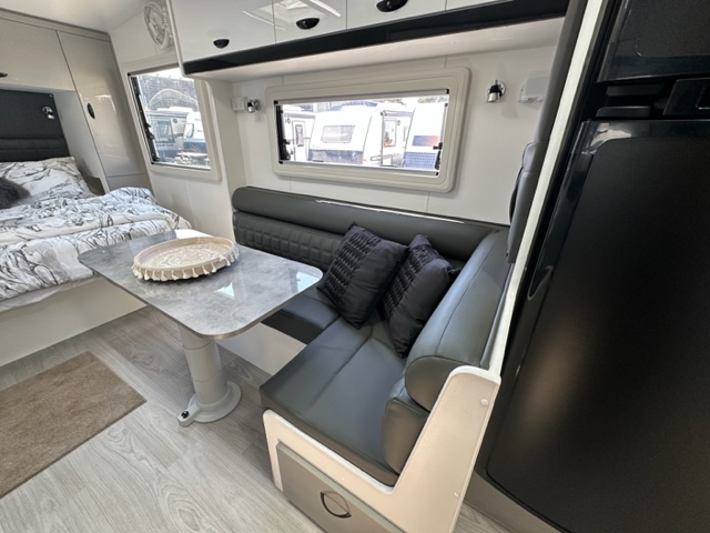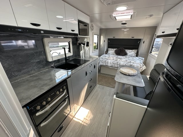 As you turn to the right you will discover an L-Shape lounge and kitchen. Your kitchen has a large 3-way 199L 2-door fridge, stove top, grill, and oven and is trimmed with the Wild Shark black pack containing a stylish kitchen sink and tapware.