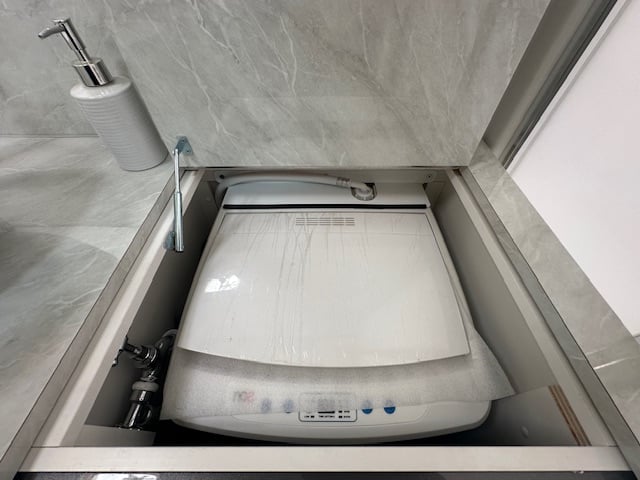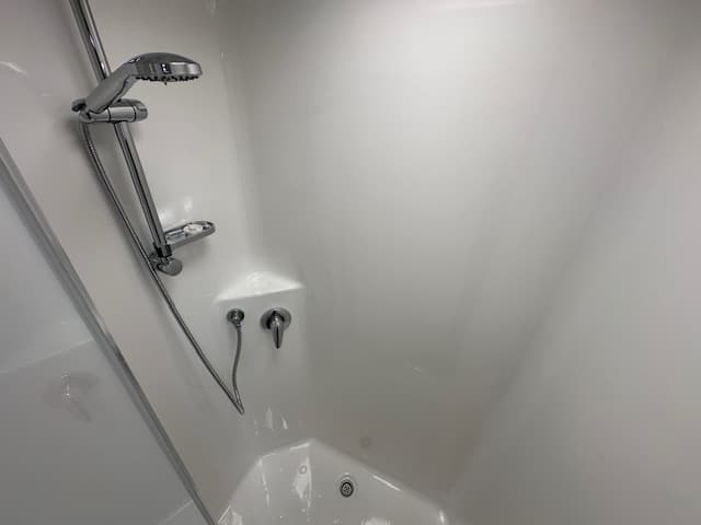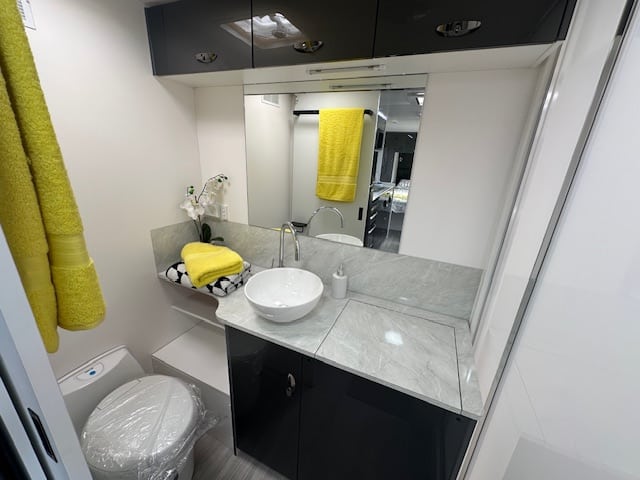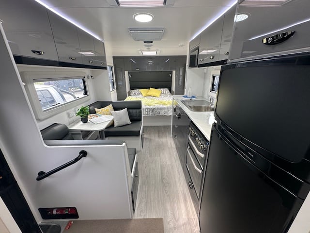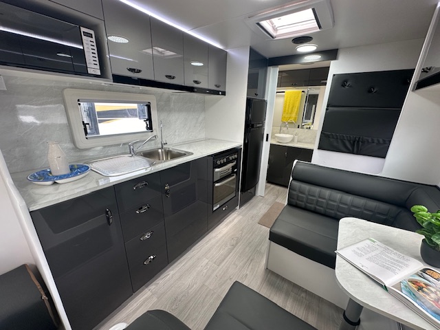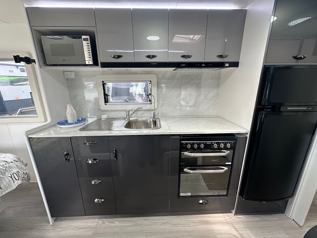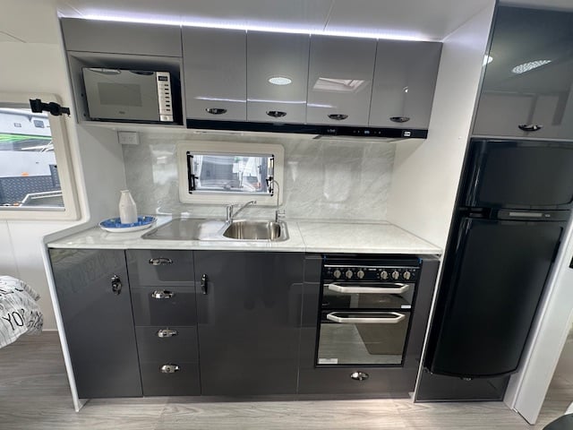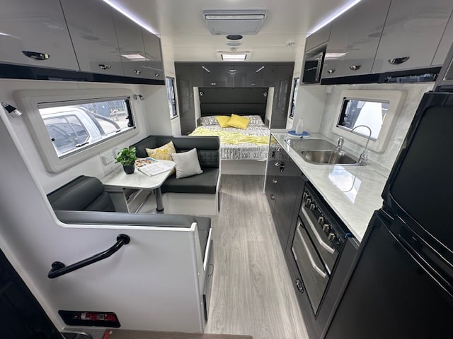 As you step into this rear door tandem model of this design to the right you have a full ensuite with 2.5kg washing machine discreetly located under a hinged benchtop to maximise bench space. A full sized generous shower, vanity and swivel toilet.