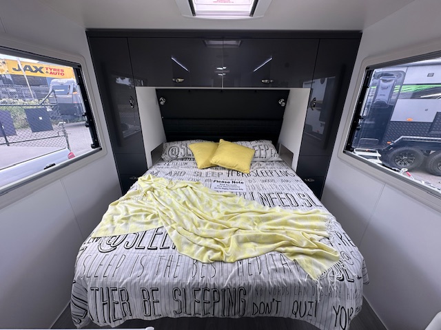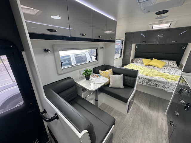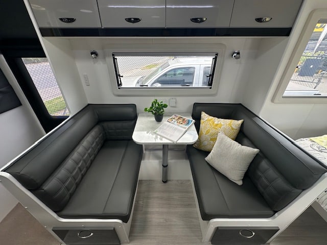 The kitchen area has a cafe seating arrangement with a tri-fold table, 166L two door 3-way fridge, full oven with grill and cooktop concealed by a hinged benchtop. The bedroom has a lift up island queen bed lift up bed with loads of storage below. The bedroom has two robes and generous over head cupboards. This caravan has a 24″ Tv and Wineguard HV antenna.