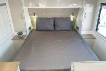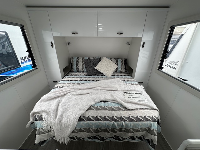As you step into the rear of the caravan to the right you have a full-size ensuite with a generous shower, vanity, toilet, and 2.5kg washing machine located under a hinged benchtop to maximise your bench space. As you turn to the right you have an L-shape lounge (also available in a straight lounge design) within the kitchen area. The kitchen has a 175L two-door 3-way fridge, stove top, grill, and oven. Below the bench, there is a convenient pull-out pantry to store condiments and keeps things in place whilst traveling keeping your kitchen organised and easy for preparing meals. Walking through the caravan the bedroom has a queen lift-up bed with storage below. The bedroom has two large windows on either side of the bedroom for ample lighting. The windows have built-in fly screens and block-out blinds.