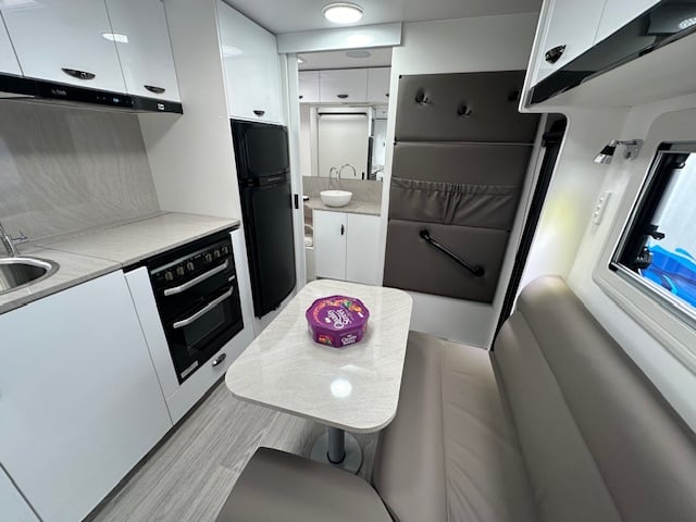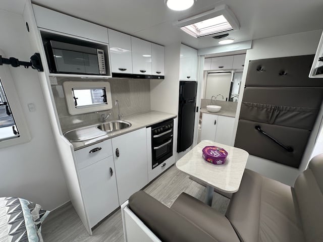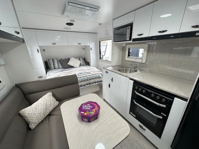 This caravan has a 135watt solar and 100amp battery that is ran through a 25amp Projecta charger. Has a full galvanised tunnel boot to maximise storage space. One 95L and one 64L water tanks on board to provide you with a generous amount of onboard water. This caravan has a reverse camera and in-car kit to give you the ability to see behind you and make backing easier.