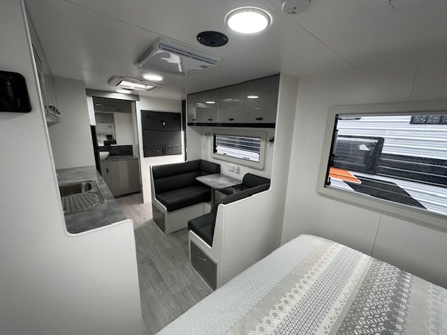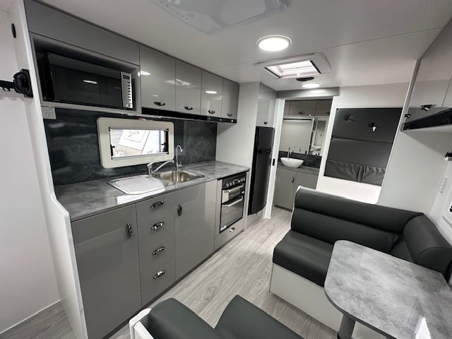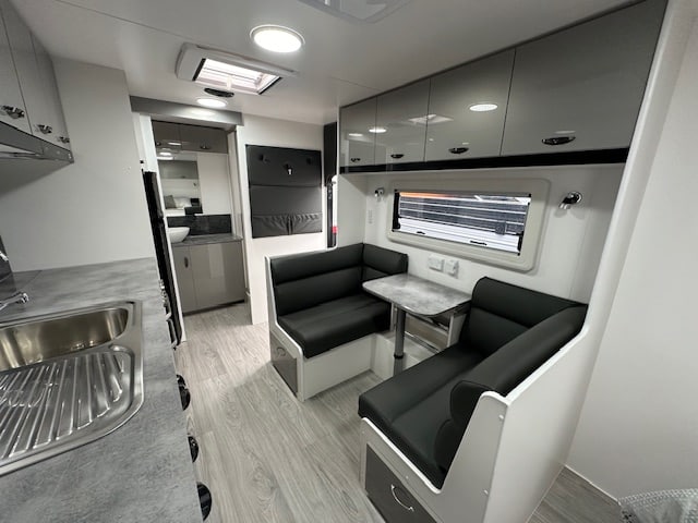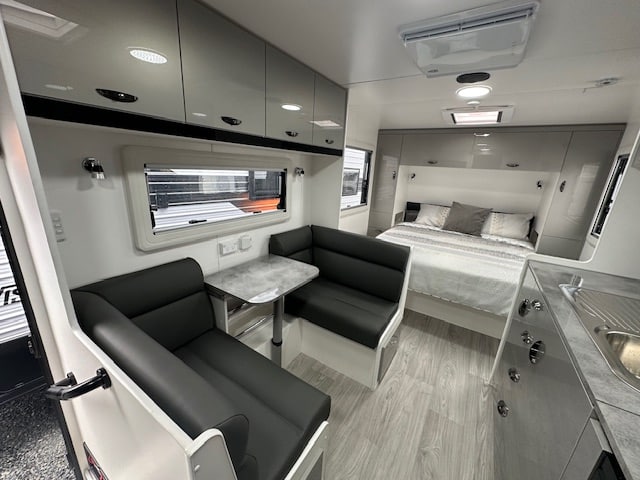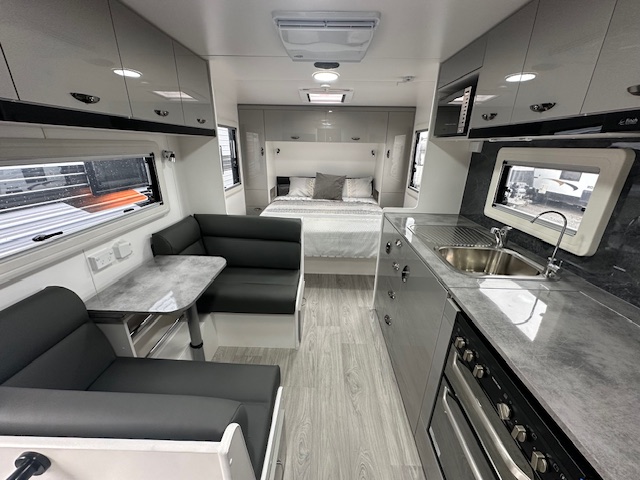 The kitchen area has a cafe seating arrangement with a bi-fold table, 166Ltr 2 door 3 way fridge, full oven with griller and cooktop concealed by a hinged benchtop. The bedroom has a lift up island queen bed.