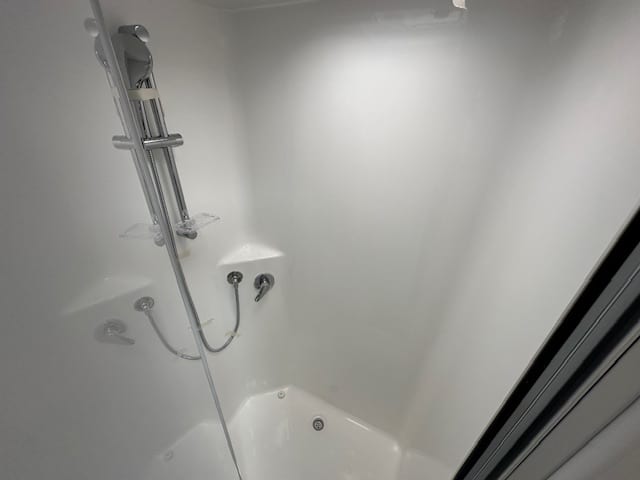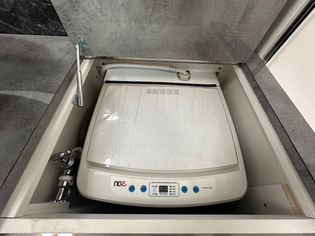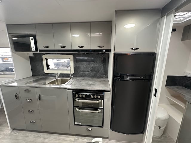 As you step into this rear door tandem model of this design to the right you have a full ensuite with 2.5kg washing machine, generous shower, vanity and toilet.