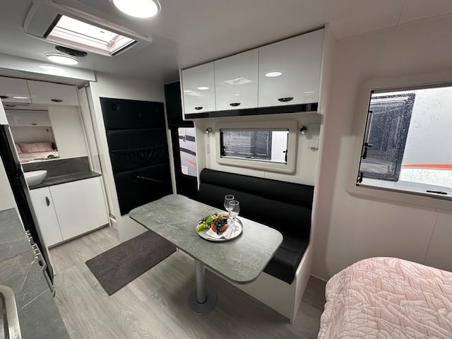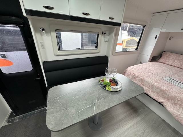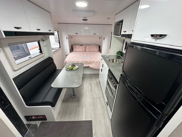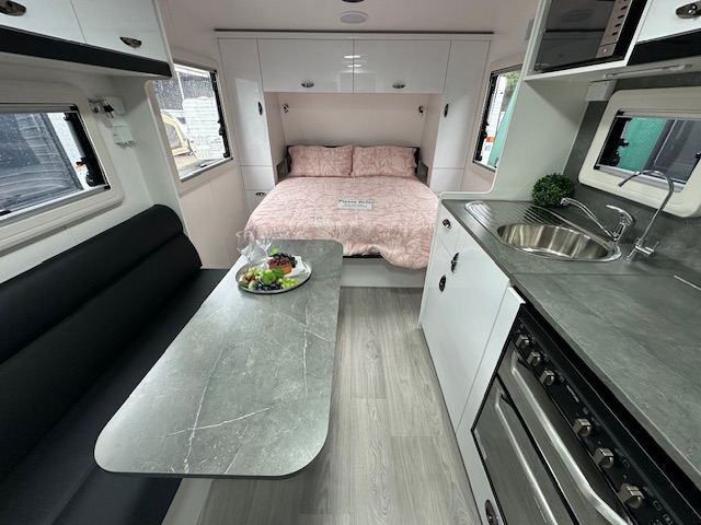 As you step into the rear of the caravan to the right you have a full-size ensuite with a generous shower, vanity, toilet, and 2.5kg washing machine located under a hinged benchtop to maximise your bench space. As you turn to the right you have an L-shape lounge (also available in a straight lounge design) within the kitchen area. The kitchen has a 175L two-door 3-way fridge, stove top, grill, and oven. Below the bench, there is a convenient pull-out pantry to store condiments and keeps things in place whilst traveling keeping your kitchen organised and easy for preparing meals. Walking through the caravan the bedroom has a queen lift-up bed with storage below. The bedroom has two large windows on either side of the bedroom for ample lighting. The windows have built-in fly screens and block-out blinds.
