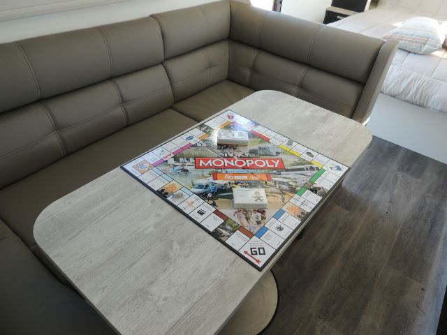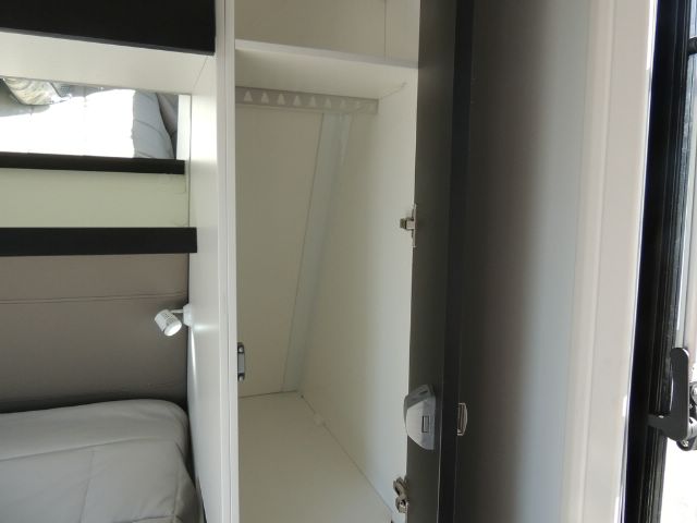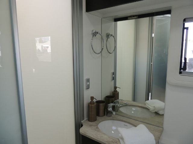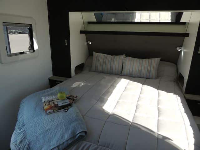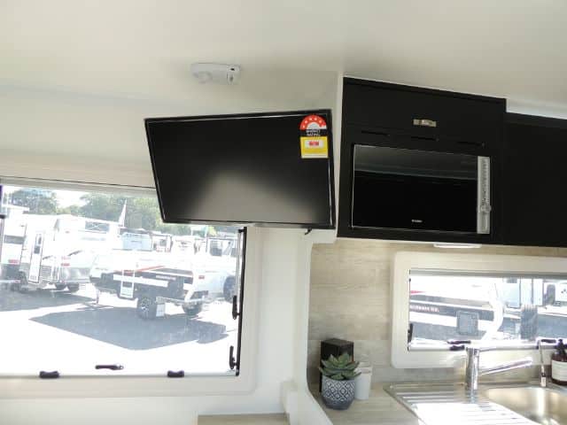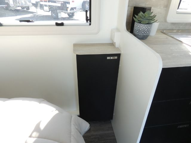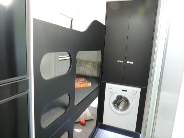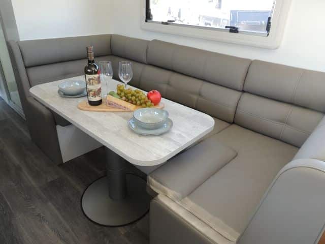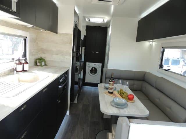 Inside you’ll be impressed with a 3-way 190L Dometic fridge/ freezer, front load washer, 3+1 cooktop & grill, microwave oven, 240V reverse cycle aircon, double glazed acrylic windows with integrated fly screens and blinds and a spacious leatherette dinette.