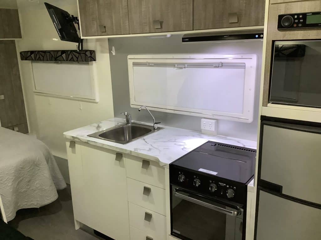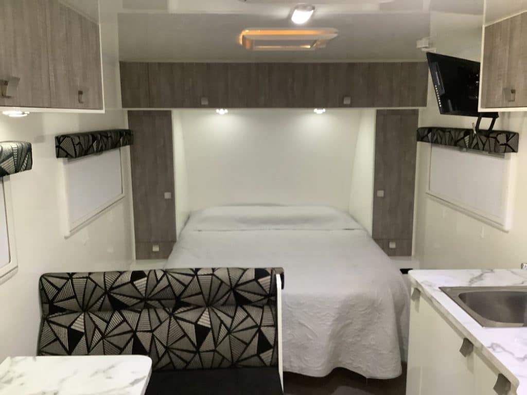5.67 mts (18 ft ) long. 3 berth with en-suite, washing machine, diesel heating, shade wall for awning, rear cargo box and much more.